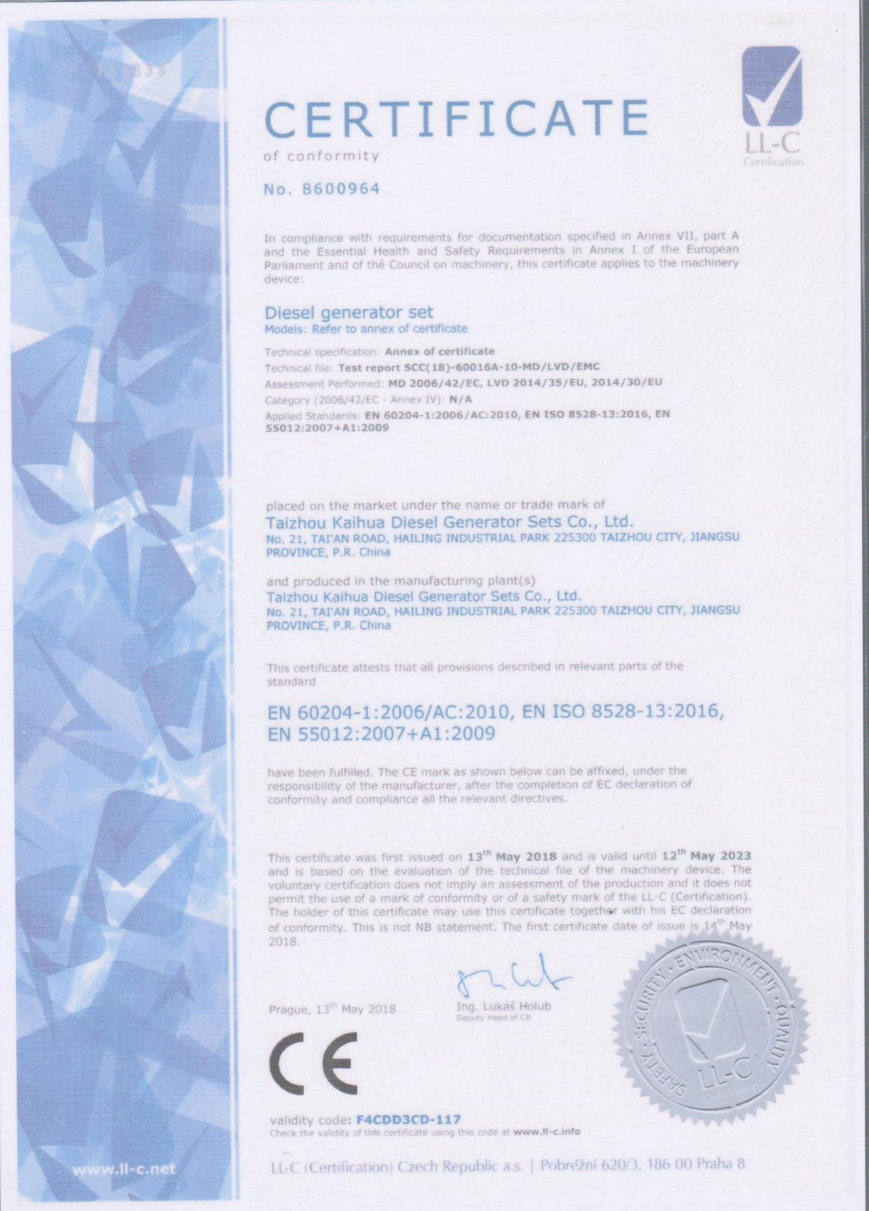 發(fā)電機(jī)組廠家凱華公司已先后通過(guò)ISO9001質(zhì)量認(rèn)證、泰爾認(rèn)證、ISO14001-2001環(huán)境管理體系認(rèn)證、GB/T28001-2001職業(yè)健康安全管理體系認(rèn)證,歐盟CE認(rèn)證、SGS認(rèn)證等。